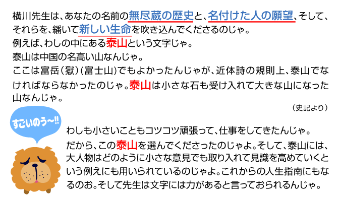 人の姓名には、無尽蔵の歴史と、名付けた人の願望が宿っている。 それらを繙(ひもと)き、新しい生命を吹き込み、漢詩に仕上げ、書家の才能が精魂込めて揮毫(きごう)した作品である。